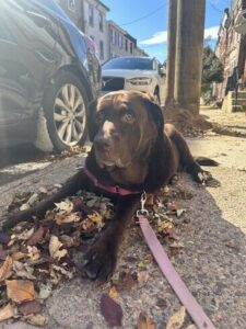 Bailey is a chocolate Labrador Retriever who came into Brookline’s care in August 2025 after being surrendered to a shelter. Born in 2017, she is just 8 years old, but years of neglect in her former home—lack of exercise and severe overfeeding—left her obese at 125 lbs. with multiple health concerns, including skin issues, cataracts, and a painful cyst on her tail.