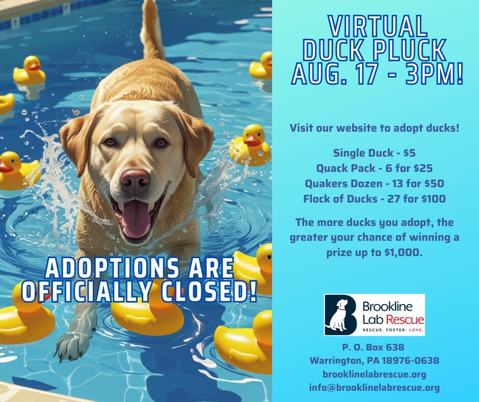 You can adopt your ducks on our website and learn more about this event at https://brooklinelabrescue.org/duck-pluck-fundraiser/. Good luck to all!