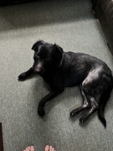 We’re now hanging out while I work, and trying to decompress with a lick mat filled with peanut butter and chicken meal topper, some jazz, and A/C. She’s nervous and stressed, so lots of pacing and coming back to me for pets and reassurances.